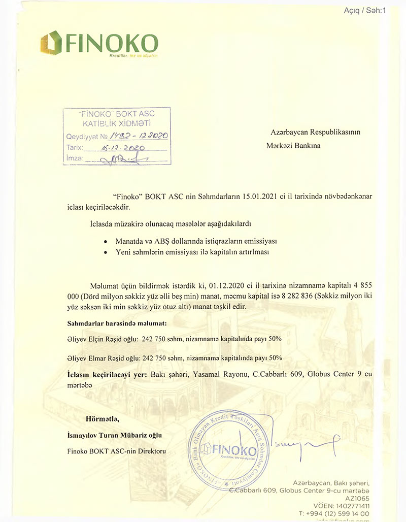 “Finoko” BOKT ASC nin Səhmdarların 15.01.2021 ci il tarixində növbədənkənar iclası keçiriləcəkdir.